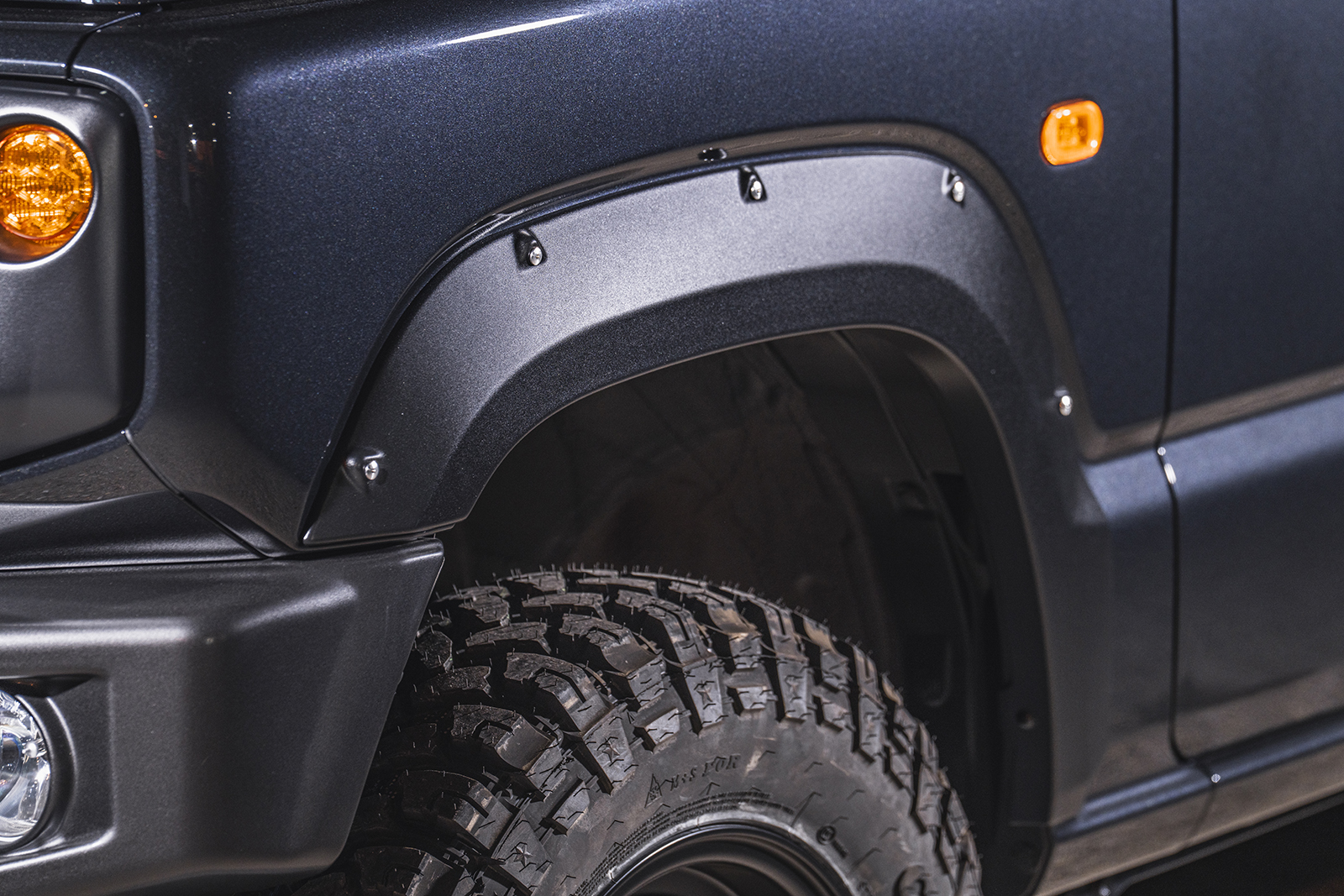 リアバンパーはあえて純正のまま。2024年2月以降、ジムニーのリアバンパーにパーキングセンサーがビルトインされている。車検等と考えると、ノーマルをキープするのも賢い選択肢だろう。その代わり、貼り付けタイプの#64オーバーフェンダーをセット。これは付け根に5つのダミーリベットを埋め込んだ、ビス留めオバフェン風のアイテム。耐候性に優れたAES樹脂製で、ザラッとした質感もポイントだ。出幅は9ミリと保安基準範囲内。