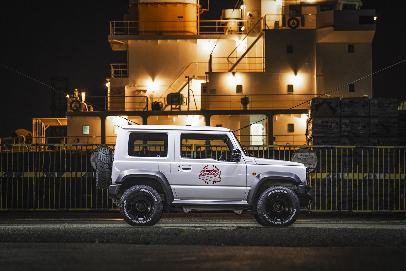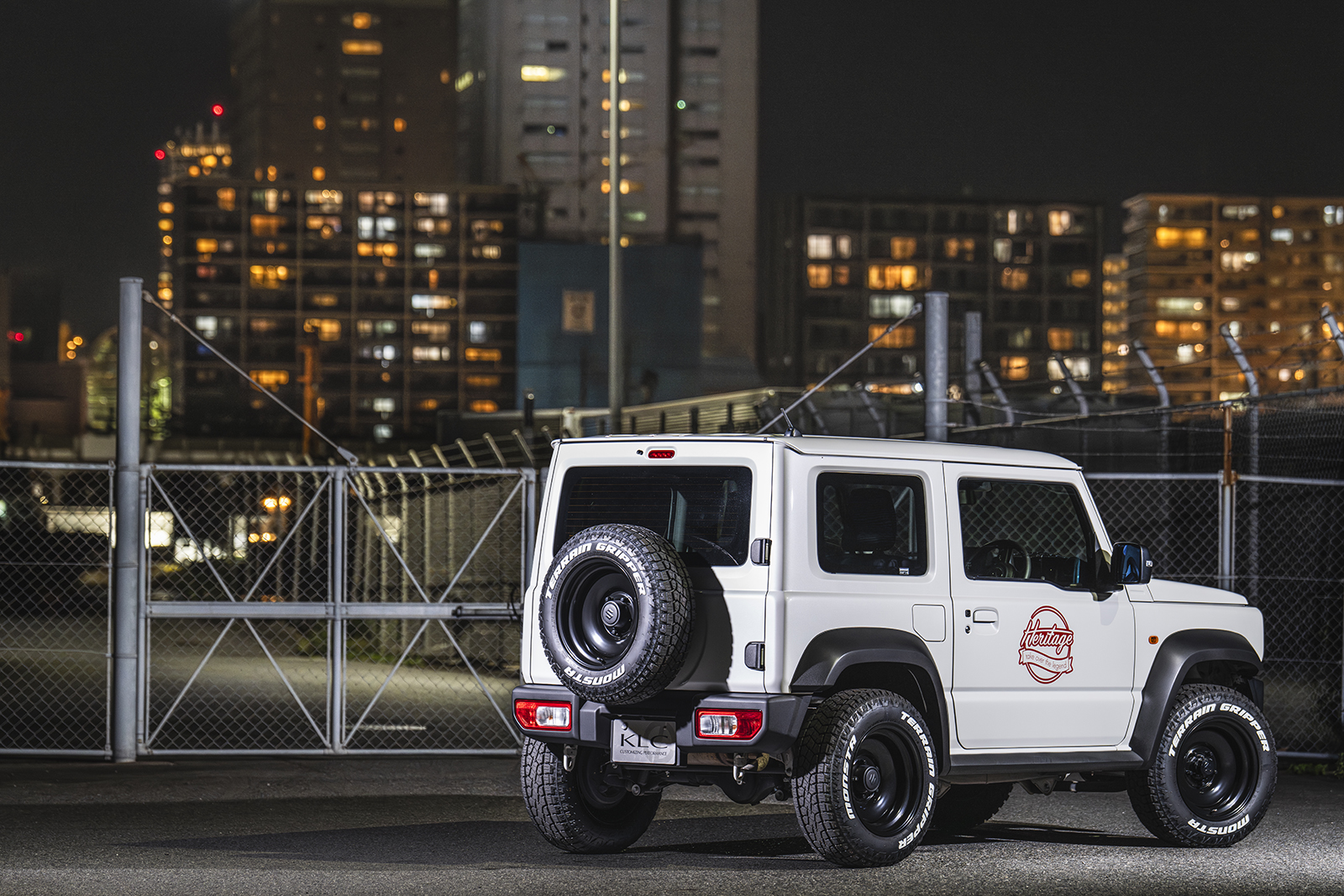 ハコスカ、ケンメリ、S30Zといったクルマたちが活躍した1970年代。マツダからはロータリーエンジンを搭載したサバンナが1971年に登場。レースではサバンナRX-3として名を馳せていたため、そちらで認識している人も多いだろう。マッシブで流麗なフォルムも高く評価されていた、そんな伝説の名車をオマージュ。昭和のフィーリングを現代のジムニーシエラに注入する。あくまでさり気なくだが、分かる人にはきっと分かる、そんなメニュー。