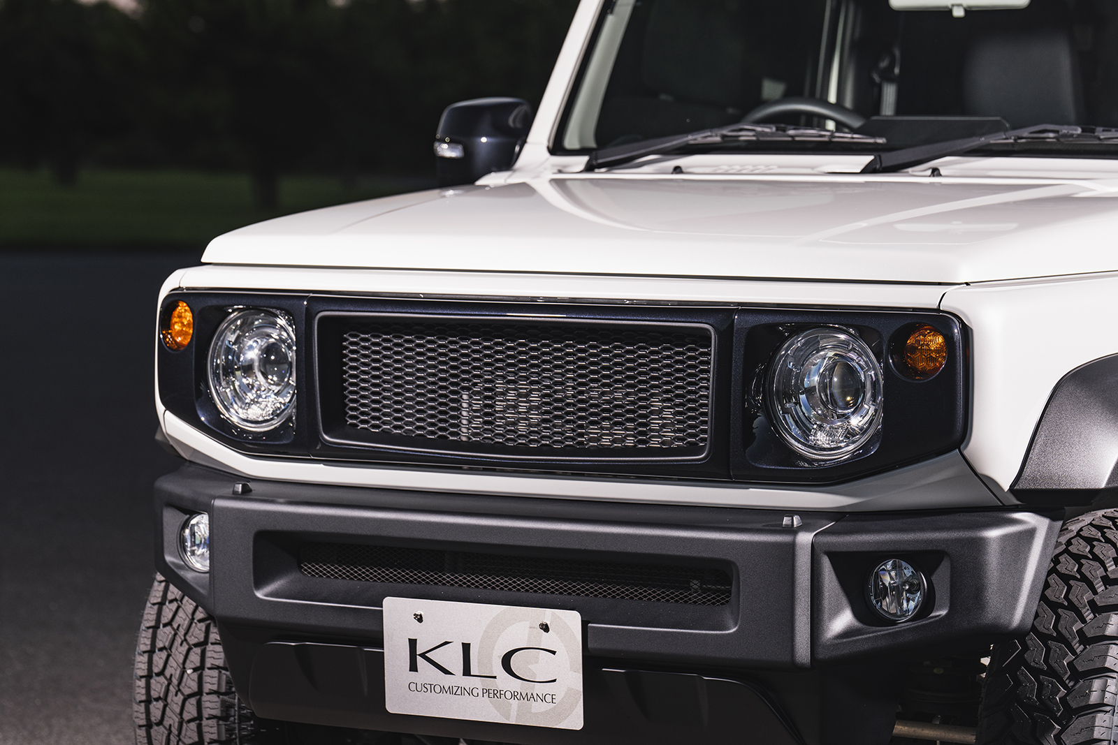 フェイスグリルは前述のマツダ・サバンナのグリルデザインをイメージ。開口部の下辺をわずかにV字にした、緩やかなホームベース型に作り込んでいる。インナーには黒の樹脂製ハニカムメッシュをセット。吸気効率の良さそうなスポーティな意匠で、レーシーさを演出する。ヘッドライトまわりは角アールの四角形で囲み、すり鉢状に落とし込んで立体感を強調。愛嬌のあるジムニーシエラの丸目を生かしつつ、よりクラシカルな眼差しに仕上げた。