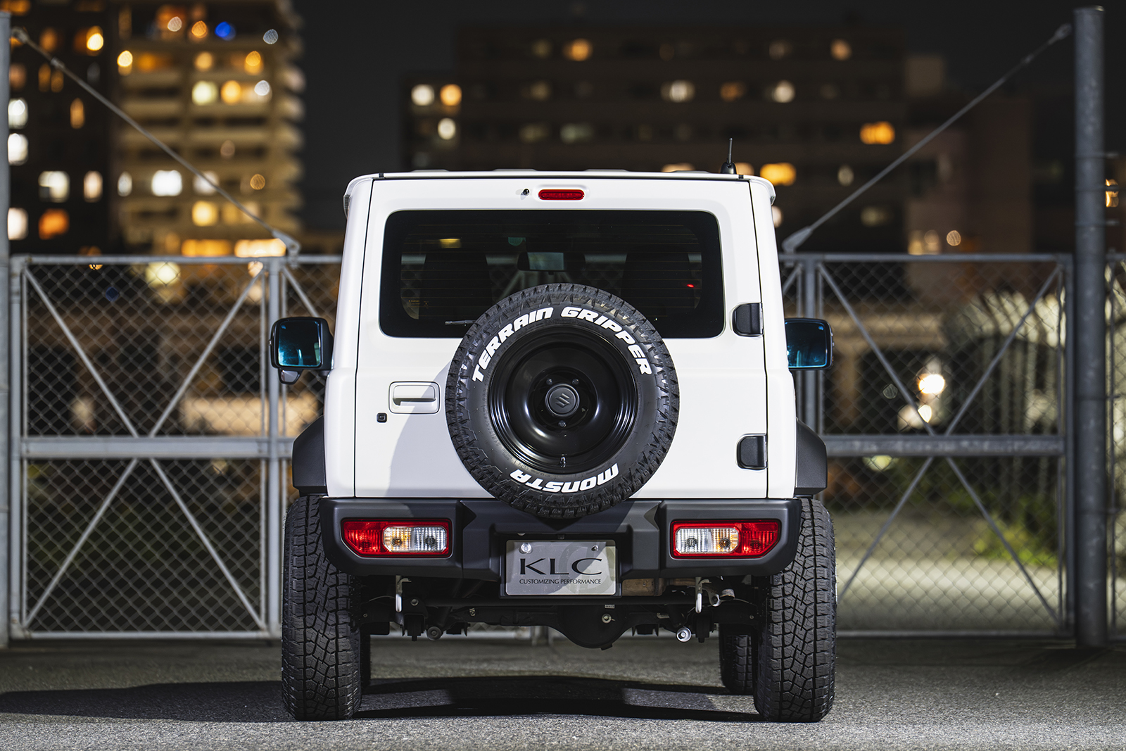 フロントは64フェイスバンパー#2に、リアは64リアバンパーに交換。どちらもジムニー用のショートバンパーゆえ、ご覧の通り純正オバフェンとは幅が合わないが、それが狙い。バンパー幅よりもフェンダーを飛び出させることで、視覚的に大きく見せられるのだ。バンパーとフェンダーが分断されて別体パーツ感も高まり、ワークスフェンダー的な印象も演出できる。上級者向けのテクニックながら、装着にあたって加工等は必要なく、基本的に車検もOKだ。