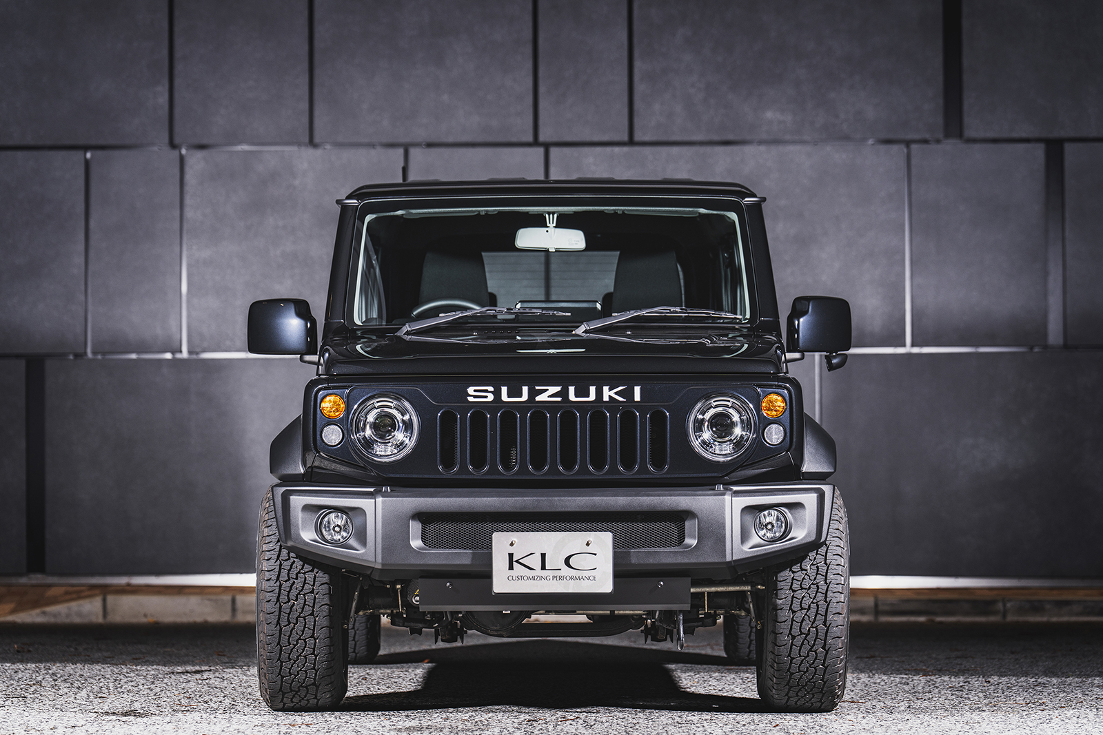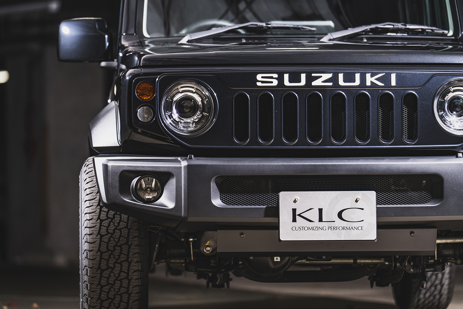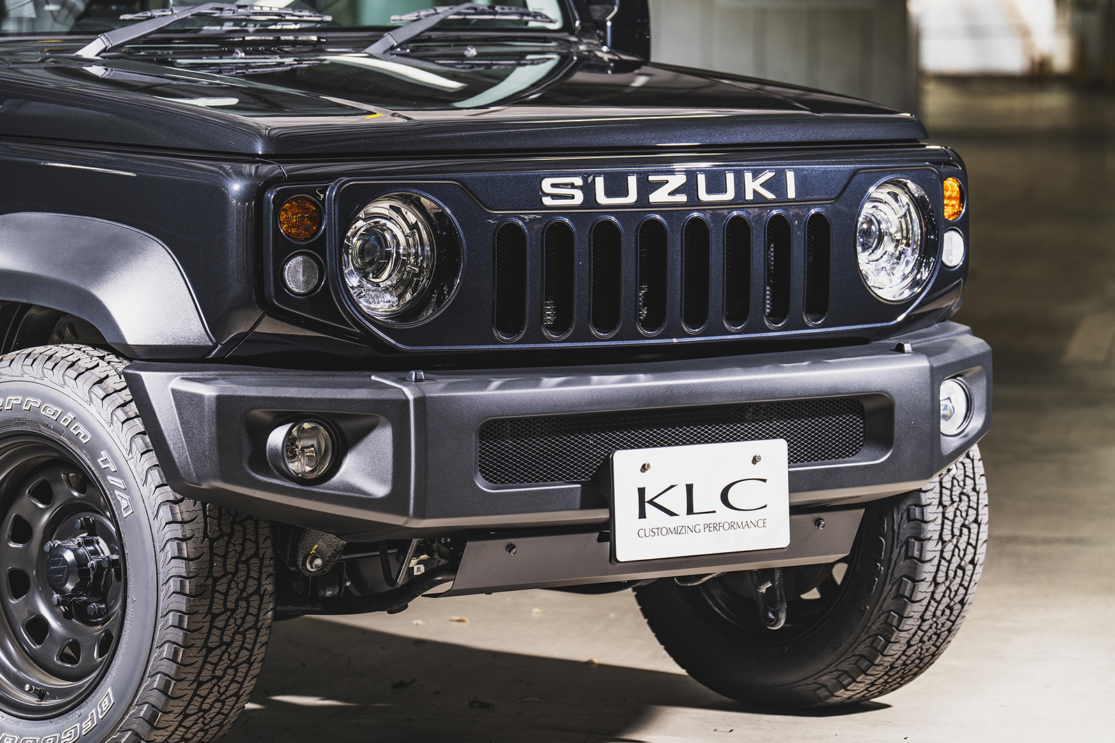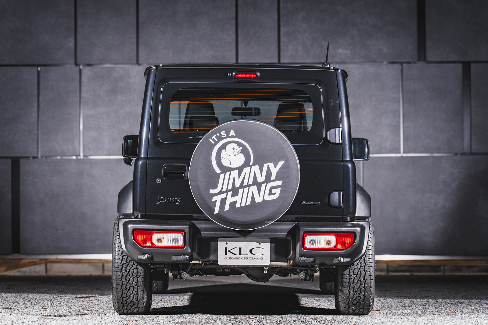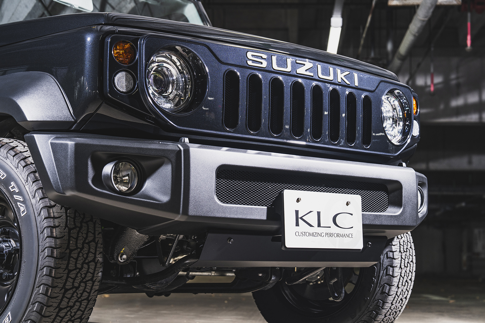 車高短風スタイルに合わせるのは、圧倒的な深さを誇るリアル鉄チンホイール「デイトナディープ」。16インチ×8.0Jマイナス20の過激サイズが、ワイド&ローを加速する。タイヤは215/65R16のオールテレーンを。ジムニー界隈で65偏平タイヤはほとんど選ばれないが、そこもあえて。8Jのリムで引っ張ってショルダーをやや寝かせ、外径をよりコンパクトに演出。結果、ホイールの存在感が際立ち、ワイドさが強調される仕掛けである。