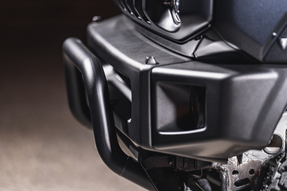 丈を短く詰めたショートバンパーは、ジムニーではお馴染みのカスタムパーツ。それにスキッドプレートを合わせるのも大定番ながら、他のジムニーと被りやすいのも否めない。もっと個性が欲しい、もっと刺激的なスタイルにしたい。そんな声に応え、ヘリテージのフロントショートバンパー64専用品として開発されたのが、このバトルスキッドプレート64だ。無地のスキッドプレートと小ぶりなブルバーを一体化させた構造で、ラフな腹下まわりを自然に隠しつつ、同時にアグレッシブさを演出できる画期的アイテム。ブルバー部分はコンパクトなJB64Wジムニーのボディに合わせ、パイプ径や横幅、曲げ角度等を最適化。立ち上げ幅もバンパー上面までに抑え、オーバーに見えないようバランスを取っている。材質はステンレス製で、ややマットな質感のブラック粉体塗装仕上げ。ボルトオンで装着可能。