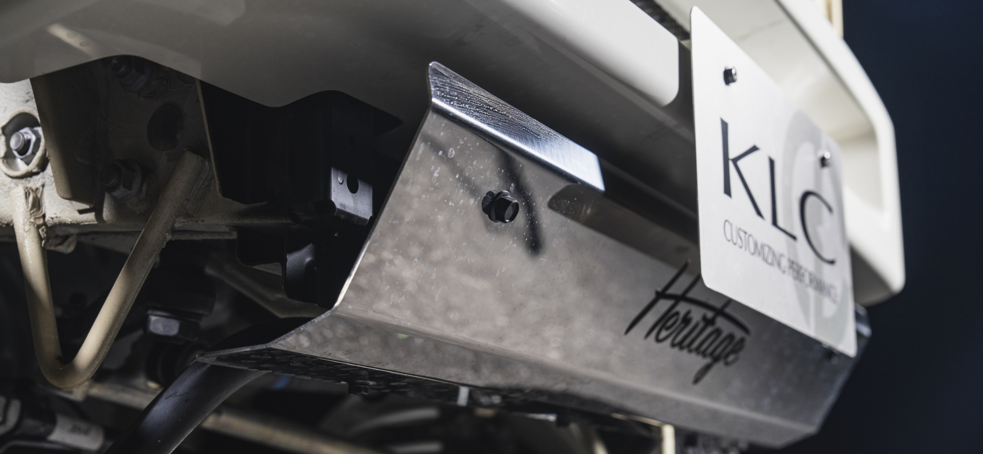 純正のデザインを踏襲しながら、純正よりも格段に薄型に作り込んだ「フロントショートバンパー64」。クロカンらしさを強調できる、大径タイヤの干渉も防げるといったメリットがあるものの、丈が短い分、腹下があらわになってしまう。それを自然に隠せる専用のオプションが「スキッドプレート64鏡面」だ。サビに強く、剛性と耐久性にも優れたSUS304ステンレスを採用。それを丹念な研磨でクロームメッキのような鏡面仕様に。キラキラの光沢がフロントマスクのアイキャッチとして活躍する。メッキ系ホイールと組み合わせると相性抜群なのはもちろん、アメリカンなムードを出したい人にもオススメ。コーナー部分は丁寧なアール処理、センターにはHeritageロゴをレーザー加工で投入するなど、ディテールも凝っている。ボルトオンで装着できるのも嬉しい。