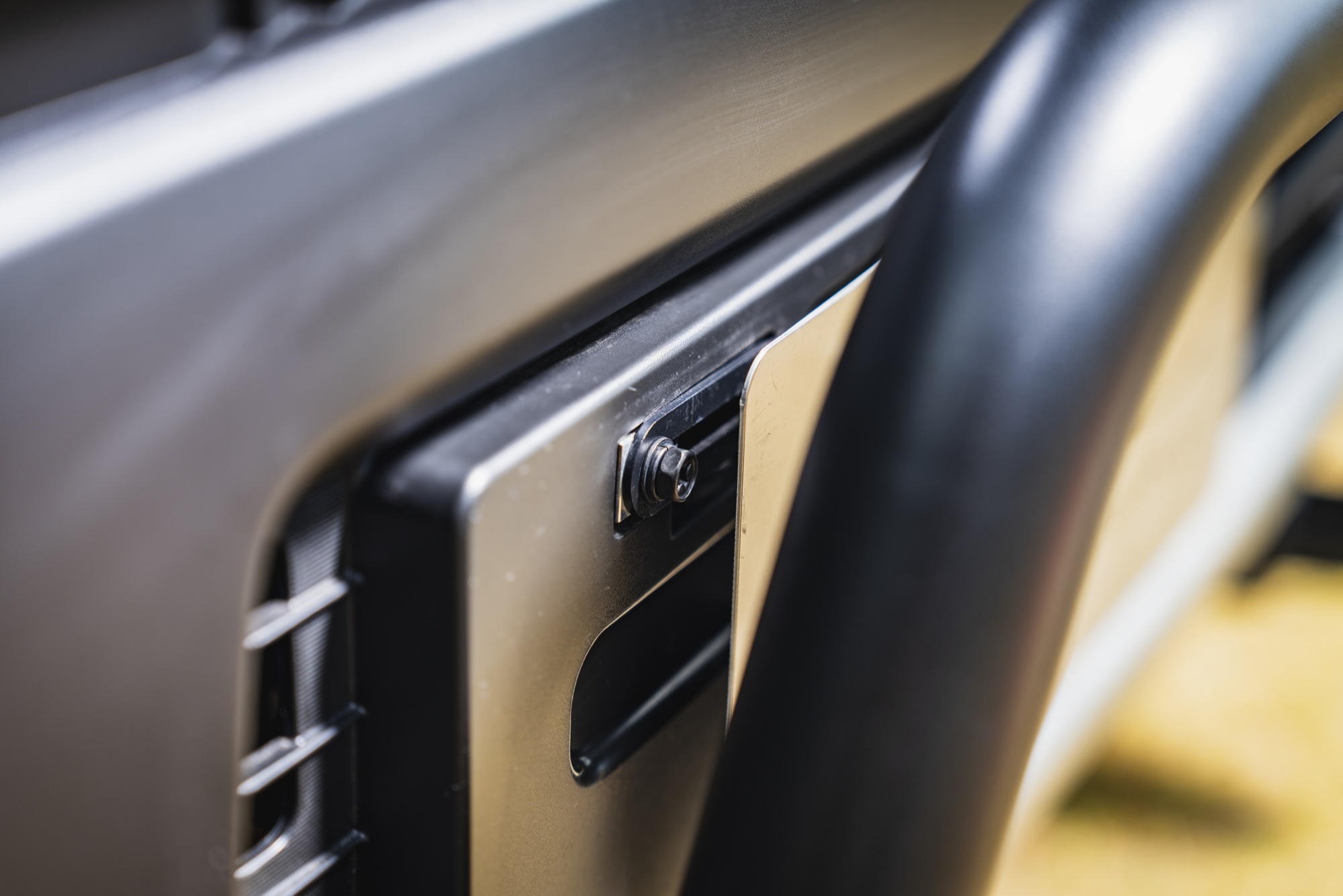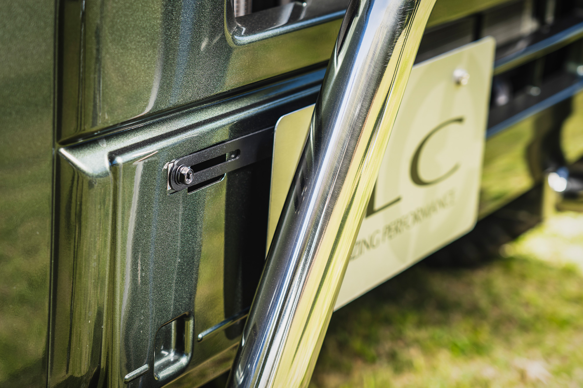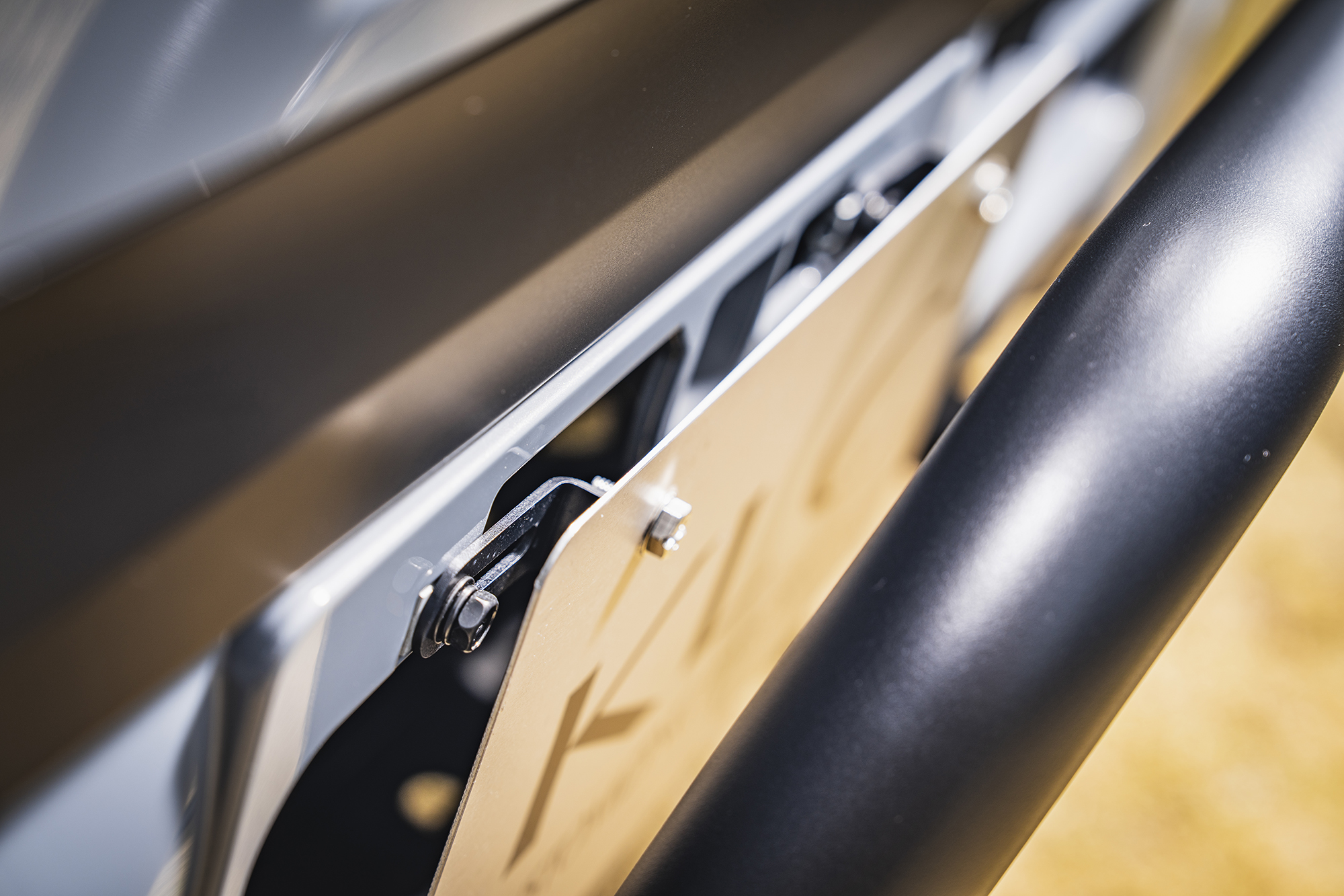 KLCブルバーのデザインはシンプル、そしてサイズはコンパクトがモットー。本場のカンガルーバーのようにハードな作りではなく、ボトムから滑らかに立ち上げたスタンダードな台形タイプとなる。この立ち上げの高さと横幅の比率、つまりタテヨコのバランスは特にこだわった部分。ワイドに広げすぎず、立ち上げすぎない絶妙なラインを突いている。きちんとブルバーらしくタフさやワイルド感を出しつつも、不必要なほどのゴツさは感じさせない。