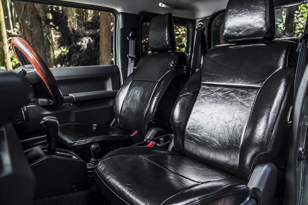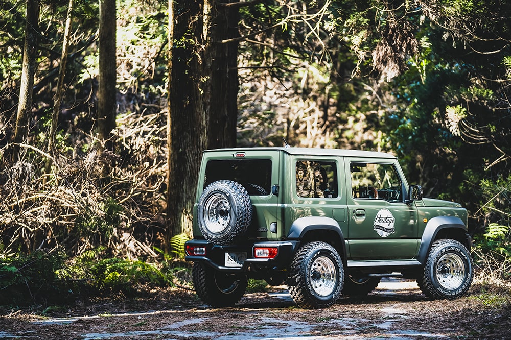 前後に付けたスチール製のスキットバーは、ジムニー用として先行リリースされていたが、シエラユーザーからの問い合わせが圧倒的に多かったため、ヘリテージのシエラ用第一弾として急遽発売決定。ヘリテージの特色である『レトロ可愛さ』よりも、シンプルかつ力強いイメージを持つスタイリングは、ワイドボディのシエラでオフ系カスタムを楽しみたい人たちにうってつけである。全体のバランスを考慮した絶妙なデザインに加えて、ヘリテージのスチールバーは匠の手によるメイド・イン・ジャパンの高品質さもポイント。下地処理にカチオン塗装を施し、防錆・防傷対策も万全。ザラッとした質感で、単なる艶消しとは一線を画すワイルドさを表現する。スキッドバーはボルトオンで装着可能。グリルも純正クリップと付属のボルトで固定する。余計な加工を必要としない装着のしやすさと、圧倒的なフィット感は、ヘリテージの高い技術とこだわりの証である。