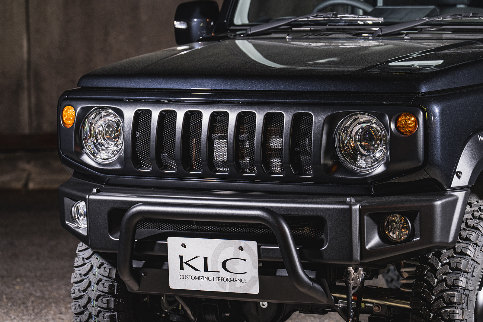 フェイスグリルは「#ナナケツ」。その名の通り、セブンスロットを採用したジープライクなデザインが特徴で、デモカーはフロントショートバンパー64と同じく「シボブラック塗装済み」を装着。純正のファイブスロットグリルよりも格段に彫りが深く、立体的な構造になっているため、真っ黒でもメリハリのある表情に仕立てられる。未塗装でも購入可能につき、それを別のカラーに塗って使ったり、ボディ同色に揃えるのも面白いだろう。
