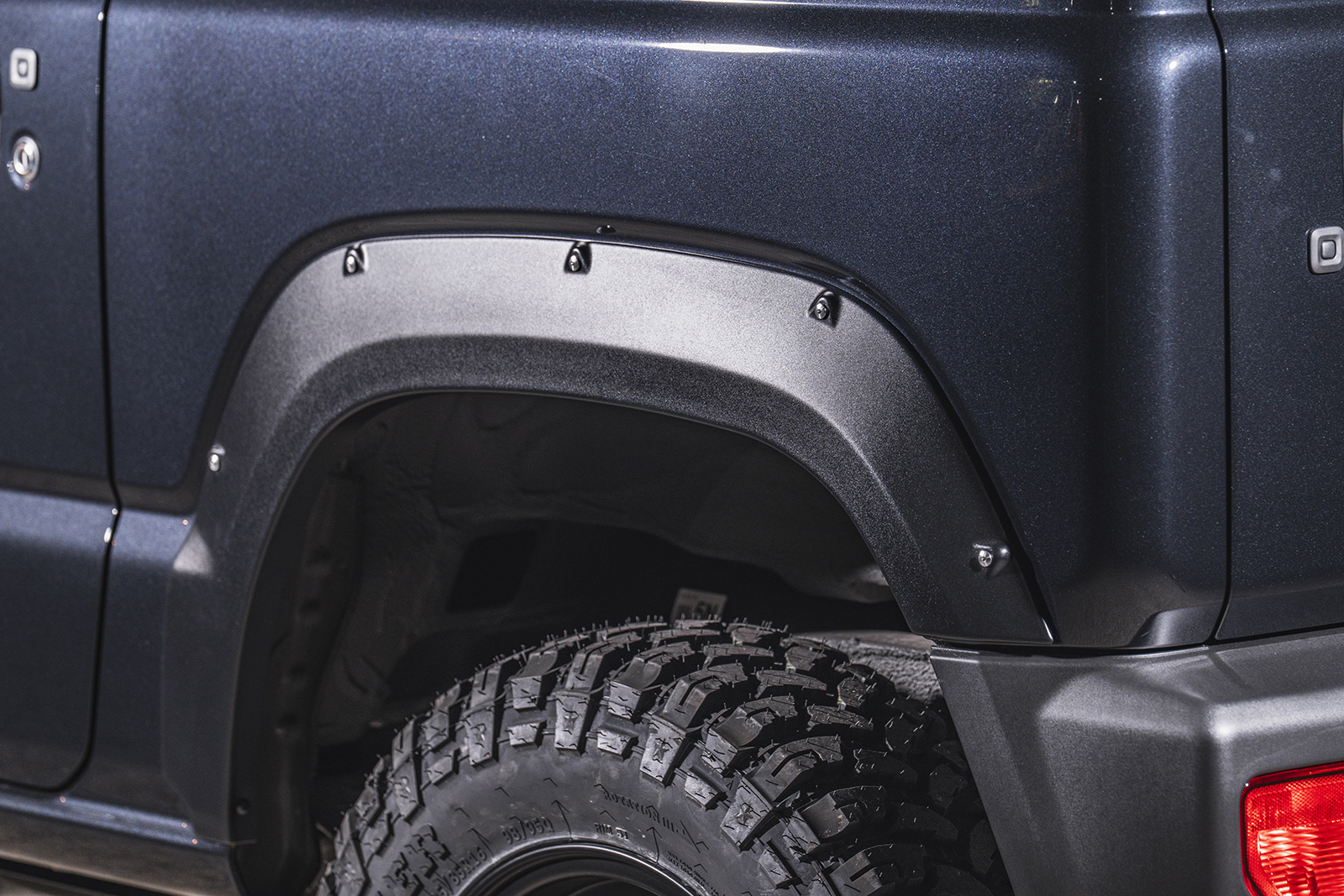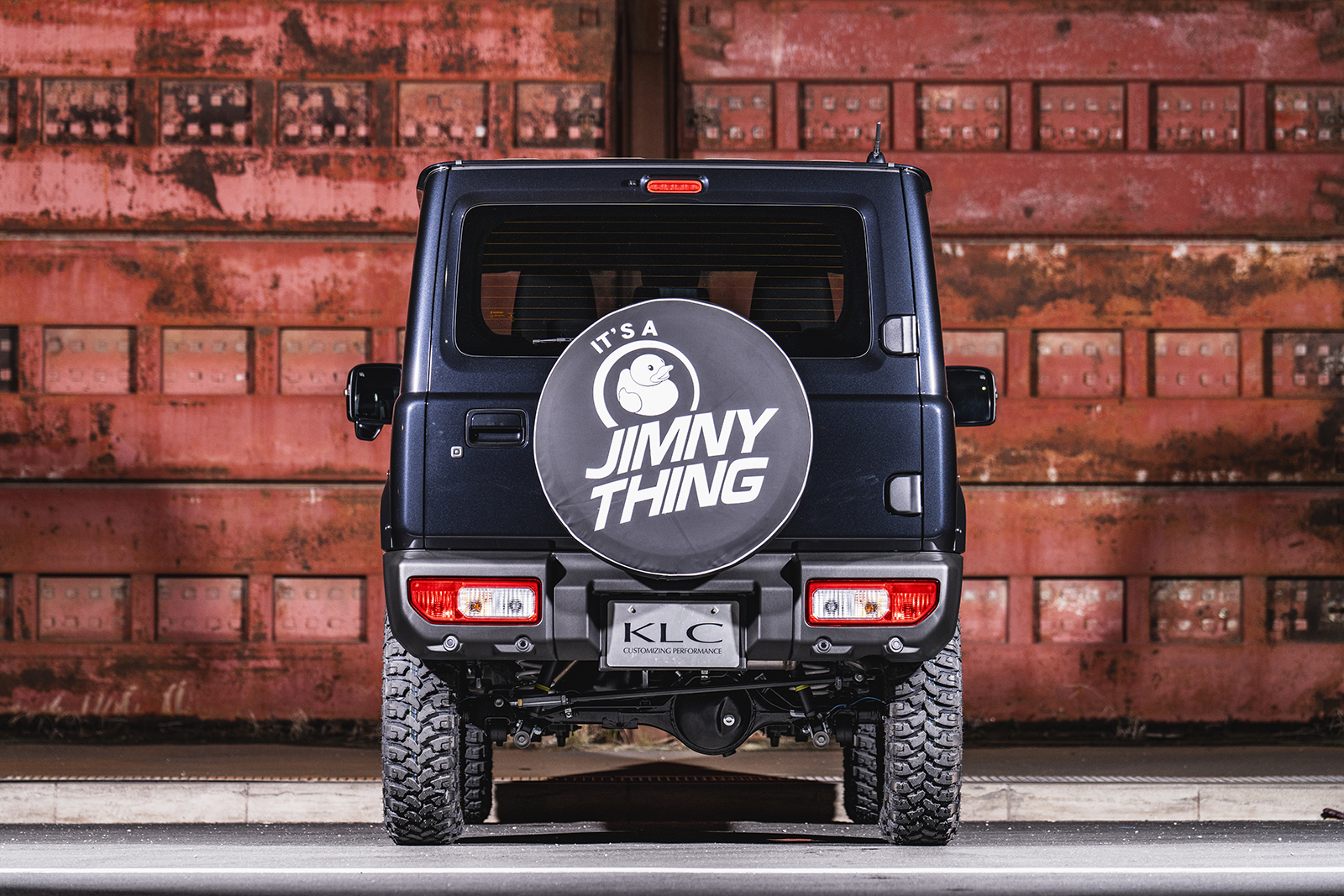 リアバンパーはあえて純正のまま。2024年2月以降、ジムニーのリアバンパーにパーキングセンサーがビルトインされている。車検等と考えると、ノーマルをキープするのも賢い選択肢だろう。その代わり、貼り付けタイプの#64オーバーフェンダーをセット。これは付け根に5つのダミーリベットを埋め込んだ、ビス留めオバフェン風のアイテム。耐候性に優れたAES樹脂製で、ザラッとした質感もポイントだ。出幅は9ミリと保安基準範囲内。
