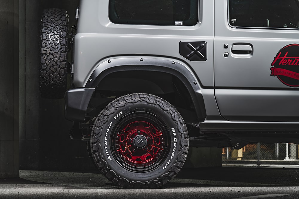 純正のカタチは極力生かしてショート化した#64フロントバンパー。フォグ横のラインをフラットな74シエラ風にアレンジして、さり気なくノーマルとの違いを見せるカスタム。アンダーガードを鮮やかな色で塗り分けると、またひと味違ったオリジナリティを演出出来る。#64リアバンパーも同様に、極限までショート化。バンパーが薄くなったことで、リフトアップサスペンションの“轟”でアゲた時の見え方も、実寸より大分上がってる感を強調できる。貼り付け式・塗装不要のオーバーフェンダーは、車検対応範囲内の出幅ながら、ダミーリベットで存在感のある作りに。ハス切り斜め出しのマフラーも最新作。マットブラックのテールは、王道にして鉄板のカッコ良さ。デモカーはシルバー×キャンディレッドで仕立てているが、これは海外でのラングラーカスタムなどを参考にしたカラーリング。フェイスグリルナナケツも、ラングラーっぽさを底上げする。