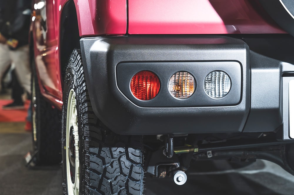 - 純正と見間違うほどに完成度の高いショートバンパーは、開口部やフォグポケットなどは極力純正のデザインを生かしたまま、上下の肉厚をバランス良くカットして短縮化。#フェイスグリル#フォーティーには大きなSUZUKIエンブレムをあしらってちょっとレトロな装いに。オレンジのステッチが可愛いデニム調シートカバーや、ドリンクホルダーなど、室内アイテムも充実。