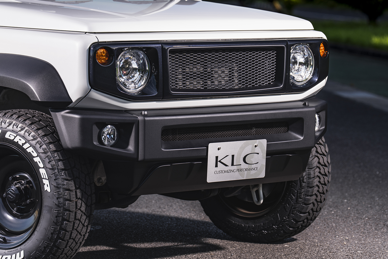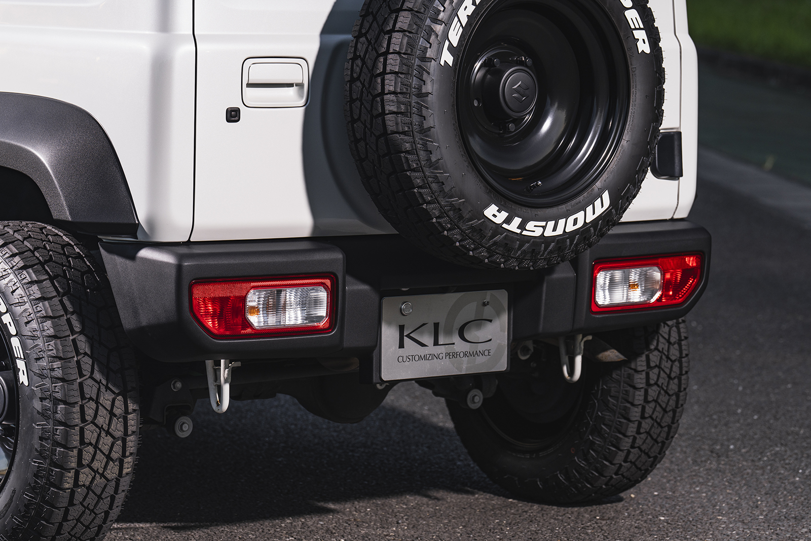 フロントは64フェイスバンパー#2に、リアは64リアバンパーに交換。どちらもジムニー用のショートバンパーゆえ、ご覧の通り純正オバフェンとは幅が合わないが、それが狙い。バンパー幅よりもフェンダーを飛び出させることで、視覚的に大きく見せられるのだ。バンパーとフェンダーが分断されて別体パーツ感も高まり、ワークスフェンダー的な印象も演出できる。上級者向けのテクニックながら、装着にあたって加工等は必要なく、基本的に車検もOKだ。
