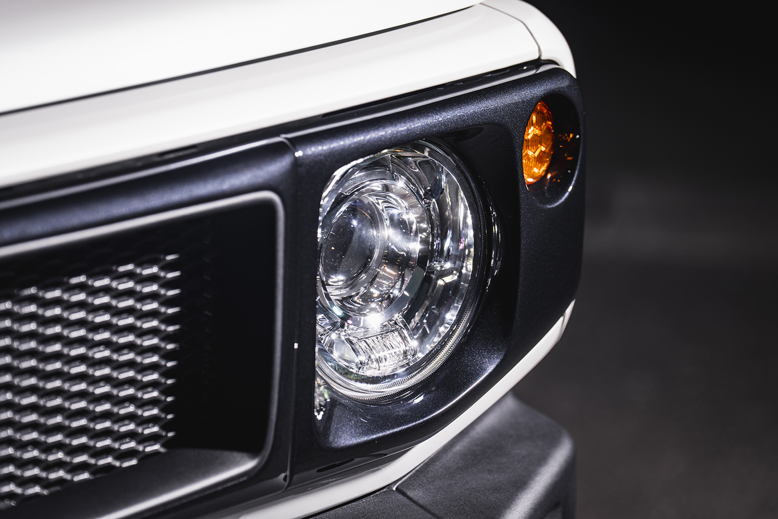 フェイスグリルは前述のマツダ・サバンナのグリルデザインをイメージ。開口部の下辺をわずかにV字にした、緩やかなホームベース型に作り込んでいる。インナーには黒の樹脂製ハニカムメッシュをセット。吸気効率の良さそうなスポーティな意匠で、レーシーさを演出する。ヘッドライトまわりは角アールの四角形で囲み、すり鉢状に落とし込んで立体感を強調。愛嬌のあるジムニーシエラの丸目を生かしつつ、よりクラシカルな眼差しに仕上げた。