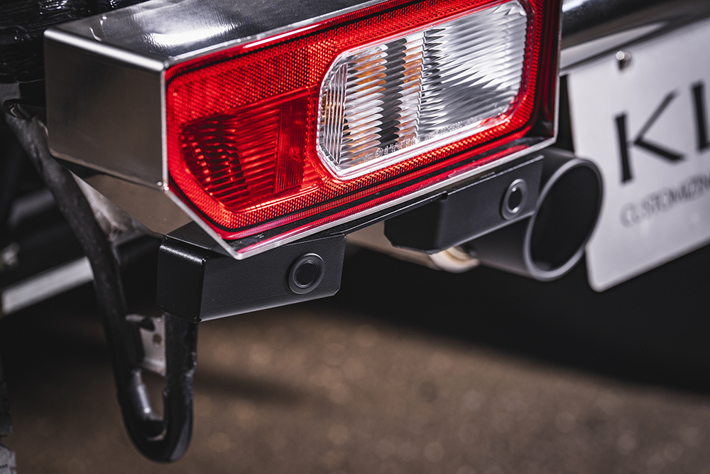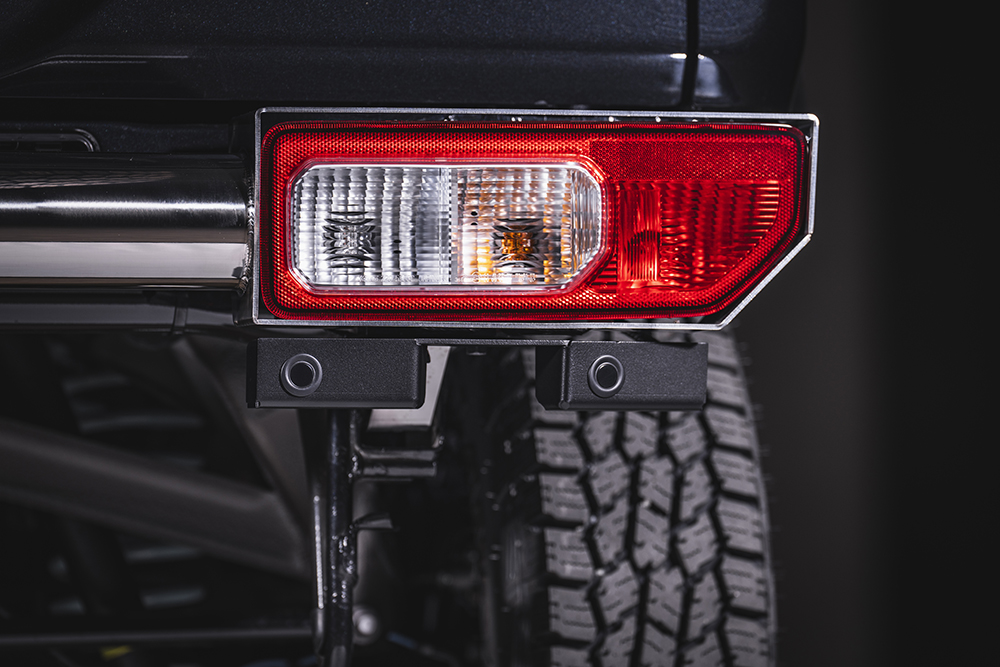 純正のリアパーキングセンサーをトラディショナルバンパーに移植できる、現行世代ジムニーのマストアイテム。リアカメラやバックセンサーといった「後退時車両直後確認装置」の装着が義務化されたことに伴い、2024年4月マイチェン以降のJB64WジムニーとJB74Wシエラ、およびJC74Wノマドは、リアパーキングセンサーが標準装備されている。しかし、それは純正リアバンパーに埋め込まれているため、トラディショナルバンパーに交換するとセンサーも一緒に外れてしまうのがネック。そこでバックソナーブラケットの出番。純正リアバンパーから4ヶ所のセンサーを配線ごと外してバックソナーブラケットに移し替え、それをトラディショナルバンパー(リア)に取り付ければOK。穴開け加工などは必要なく、ボルトオンで簡単に装着できる。センサーの位置や角度は純正とほぼ同等。外側2つはナナメ外向きになっているところまでしっかり再現しているので、機能性も損なわない。ブラケット本体は頑丈なステンレス製、ブラックのパウダーコート仕上げとなる。