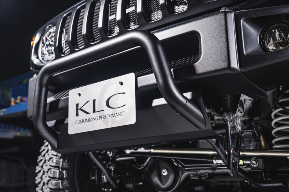 丈を短く詰めたショートバンパーは、ジムニーではお馴染みのカスタムパーツ。それにスキッドプレートを合わせるのも大定番ながら、他のジムニーと被りやすいのも否めない。もっと個性が欲しい、もっと刺激的なスタイルにしたい。そんな声に応え、ヘリテージのフロントショートバンパー64専用品として開発されたのが、このバトルスキッドプレート64だ。無地のスキッドプレートと小ぶりなブルバーを一体化させた構造で、ラフな腹下まわりを自然に隠しつつ、同時にアグレッシブさを演出できる画期的アイテム。ブルバー部分はコンパクトなJB64Wジムニーのボディに合わせ、パイプ径や横幅、曲げ角度等を最適化。立ち上げ幅もバンパー上面までに抑え、オーバーに見えないようバランスを取っている。材質はステンレス製で、ややマットな質感のブラック粉体塗装仕上げ。ボルトオンで装着可能。