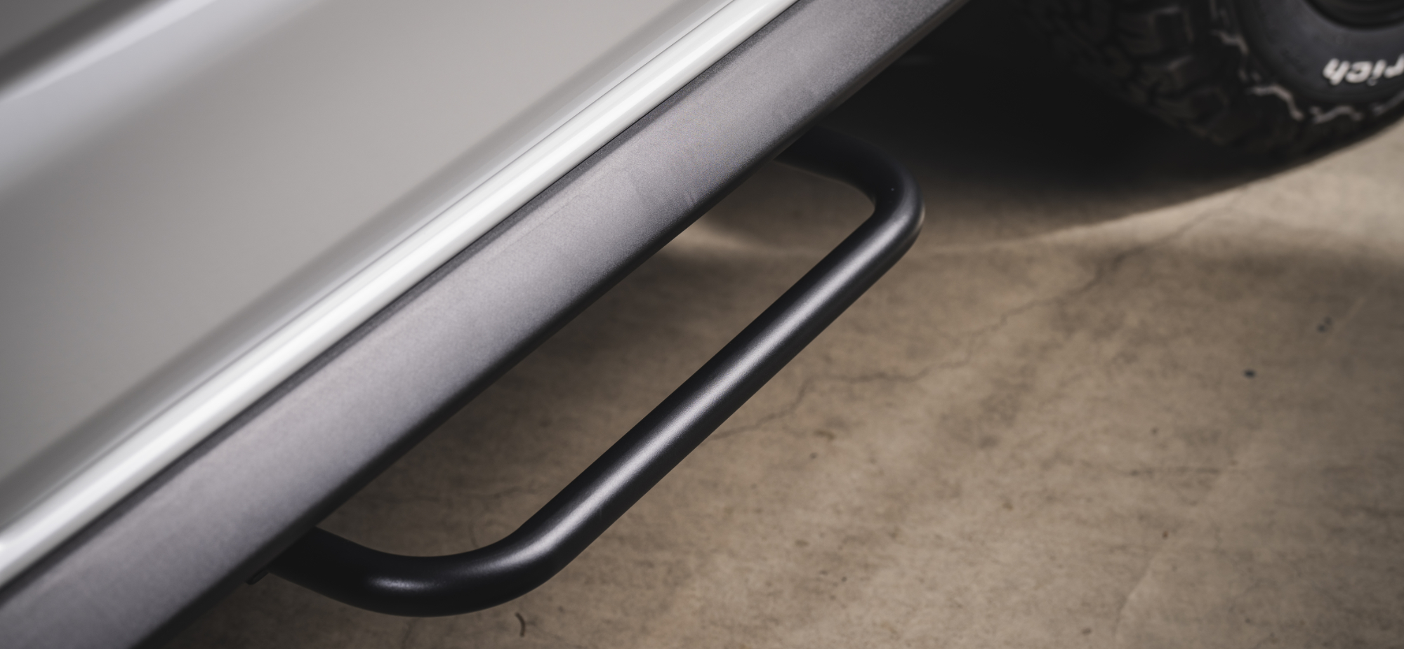 ブルバーやスキッドバーといったガードパイプ系のバンパーと相性のいい無骨なサイドステップ。1本のパイプで構成する超シンプルな設計で、サイズもコンパクトだから主張しすぎず、ジムニーのボディにナチュラルに馴染む。もちろん足を乗せる幅はしっかり確保。車高を上げたり大径タイヤを履かせても、このステップがあればスムーズに乗り降りできる。素材は頑丈なスチール製を採用し、カチオン電着塗装+黒のパウダーコートでさらに耐久性&耐候性をアップ。1型・2型は完全ボルトオンで装着OK。3型以降は樹脂カバーの一部カットといった簡単な加工が必要になる。64ジムニー/74シエラの両方に対応したカスタムパーツ。