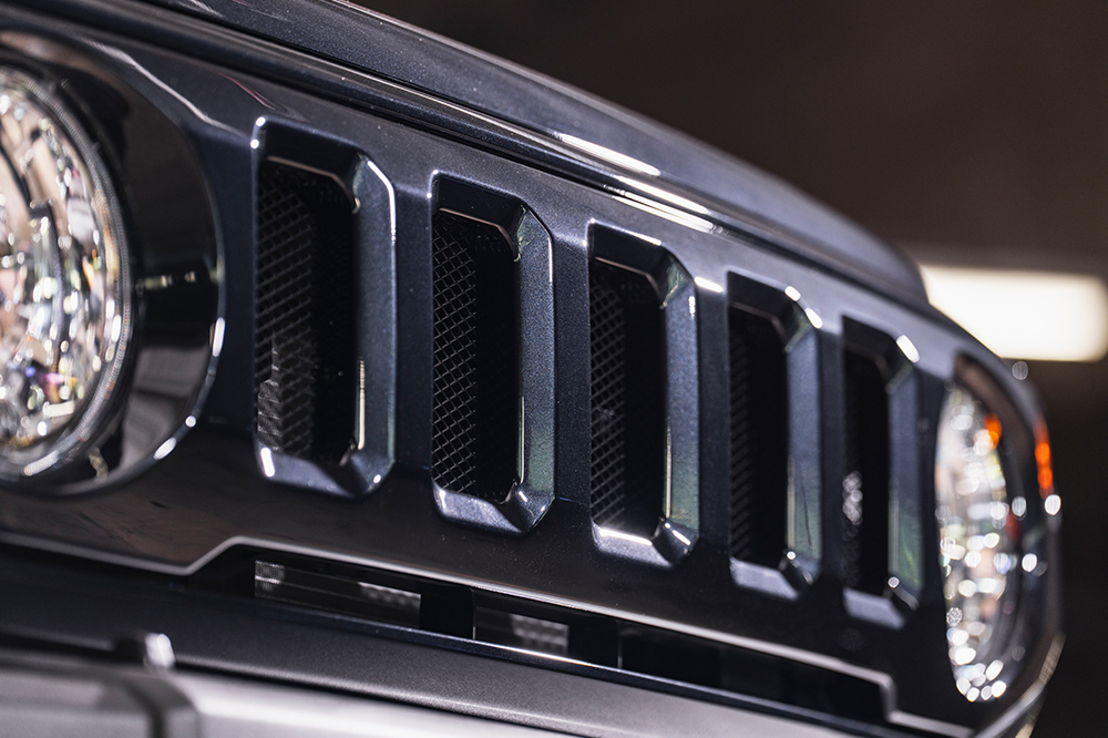 純正グリルから中央のSマークだけをキレイに取り去った意匠を採用。ヘッドライトやウインカーまわり、特徴的なファイブスロットもそのままの造形となるので、ちょっとだけ違いを出したい、フロントマスクをスッキリ見せたいという人に最適だ。素材は耐久性・耐候性に優れ、高いフィッティング精度を出せるABS樹脂製。ゆえに塗装済みでの販売にも対応しており、純正ボディカラーの5色と、シボブラックを加えた合計6色から選べる(未塗装品もアリ)。ちなみに純正グリルの表面には細かな凹凸があり、ただ塗装してもツルツルには仕上がらない。対して本商品の表面は滑らかなので、艷と高級感のあるフィニッシュが可能。チープな質感の純正とは雲泥の差だ。また裏側には黒のアルミメッシュが付属。純正のハニカムメッシュよりも格段に目が細かく、シンプルな作り。このさり気ない違いもポイント。