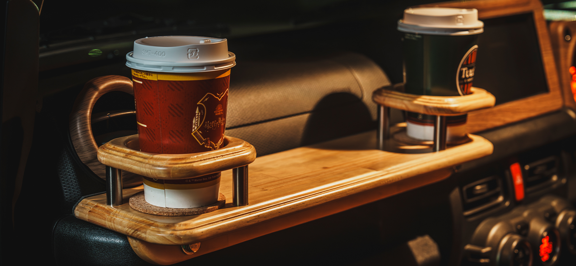 機能性を重視した質実剛健なジムニーのインテリア。その無骨なデザインに温かさを与えてくれるリアルウッド製のフロントテーブルが誕生。コーナー部の滑らかなアール加工や多段的な面取り加工、ほどよく艶と深みを出した表面処理など、1つ1つが熟練の職人によるハンドメイド仕上げ。左右にはステンレスの3本足が美しいカップホルダーを装備。右は運転席用、左は助手席用と2人で使える便利な仕様になっている。取り付けはアシストグリップに付いている2本のダミーボルトを外し、付属のビスで固定するだけ。ヘリテージのオーディオパネルカバーやメーターパネルカバー、エアコン吹き出しカバーといったウッド調パネルと組み合わせるのもオススメだ。