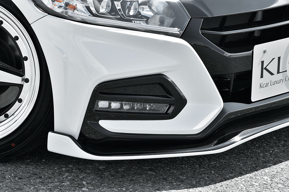 約30ミリ(下方向への延長は約15ミリ)という厚みの中に立体的な高低差を造形。塗り分けに適したデザインを実現したアンダーリップ。純正バンパーの切り上げに沿うように持ち上げたことで装着後の一体感を増しています。また、フロントフェイスにはガラリと印象を変えるルーバータイプのグリルとポジションカバーを設定。まるで欧州車のスポーツクーペのような佇まいへと変貌させます。